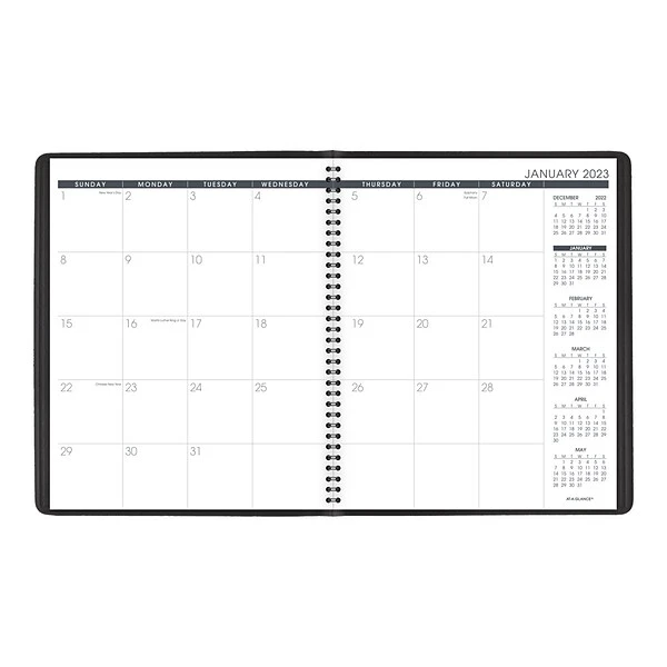 - One month per two-page spread with unruled daily blocks; past, current and four future month reference calendars for quick date checking