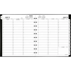 - One week per two-page spread has ruled columns with quarter-hourly appointment times from 7:00 a.m. to 8:45 p.m. on weekdays, and from 7:00 a.m. to 5:30 p.m. on Saturdays; one month per two-page spread has unruled blocks for open planning, with past, current, and future calendar references