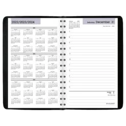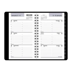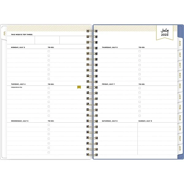 - One week per two pages with Saturdays and Sundays condensed, to-do checklists, and space for this week’s top three priorities; one month per two pages with space for notes and to-dos, as well as previous and next month references