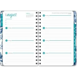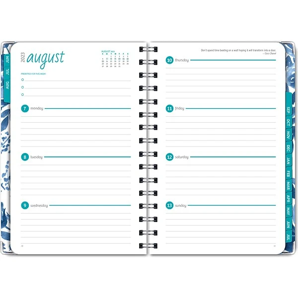 - Two-page monthly spreads with space for notes and previous and next month reference; two-page weekly spreads with space for top priorities for the week and current month reference calendar