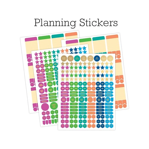 - Also features silver-tone spiral binding, tabbed section dividers, sticker sheets, a bookmark, and a pocket folder