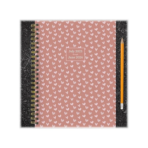 As pretty as it is functional, this stylish academic year planner is sure to keep you organized. Measuring 6.5″ x 8″, this TF Publishing Pink Hearts all-encompassing medium planner boasts two-page monthly spreads that include lined sections for notes, tasks, and goals, and two-page weekly spreads with lined daily sections to keep plans neat and organized, plus a dedicated weekly priorities section to help keep you focused. The interior pages are designed with a classic and refined color, accented with faux monthly tabs for easy access to weekly planning. Enhance your daily plans with 368 color-coordinating stickers to highlight special occasions and personalize your planner. Bonus lined notes pages are in the back, with yearly 2023 and 2024 views in the front. Features a durable textured cover and sophisticated gold-tone wire-O binding designed to lay flat when open. Spanning the months of July 2023 through June 2024, this planner has a plastic-free cover and is fully recyclable.