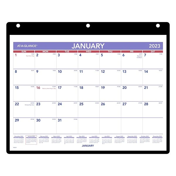 This AT-A-GLANCE monthly calendar allows you to keep track of important info and protects your calendar pages, so you never miss a meeting because of a coffee stain again. Three-hole punched so you can keep it on your desk or hang it from the wall.