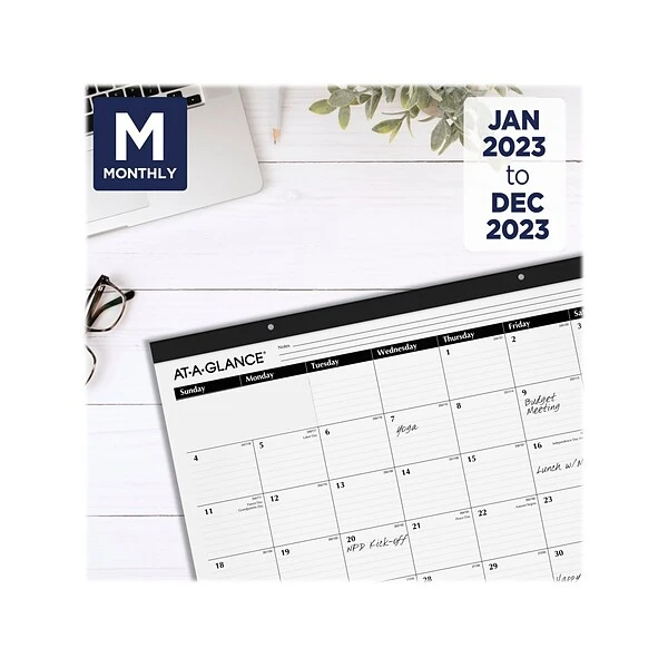 Stay up to date and on task with the ruled classic styling of this professional desk pad. Take notes, make appointments, and track monthly goals on this professional desk pad. The ruled daily blocks are perfect for keeping detailed reminders aligned and easy to read. The desk pad covers a 12-month date range from January 2023 to December 2023.