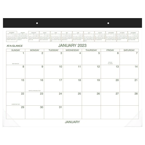 The monthly desk pad by AT-A-GLANCE is printed in green and brown ink with unruled daily blocks for notes. With a sturdy writing surface and wide headband, the desk pad makes a convenient monthly desk or wall calendar. The desk pad covers a 12-month date range from January 2023 to December 2023.