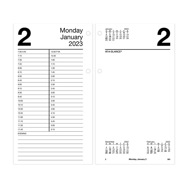 The AT-A-GLANCE large daily desk calendar refill features past, current, and future month reference. Keep up to date and organized with this daily desk calendar refill. The two-page spreads include quarter-hourly appointment times and open writing space.