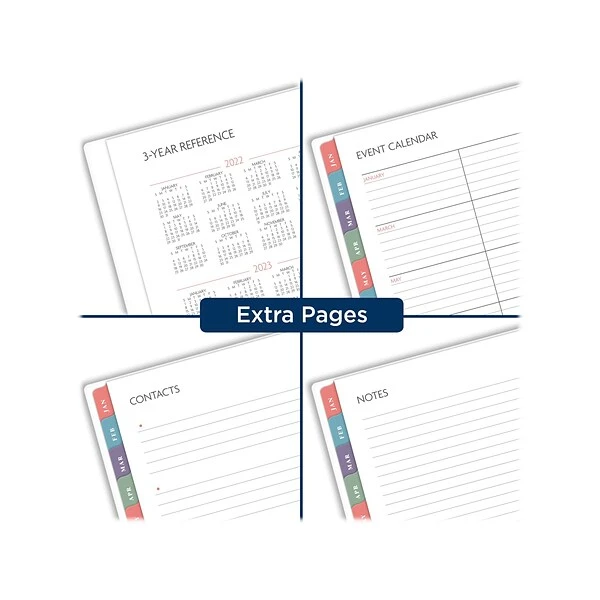 - Special pages include a holiday list, seven contacts pages, six notes pages, a three-year reference calendar, an event calendar, and a double-sided poly pocket to store loose sheets