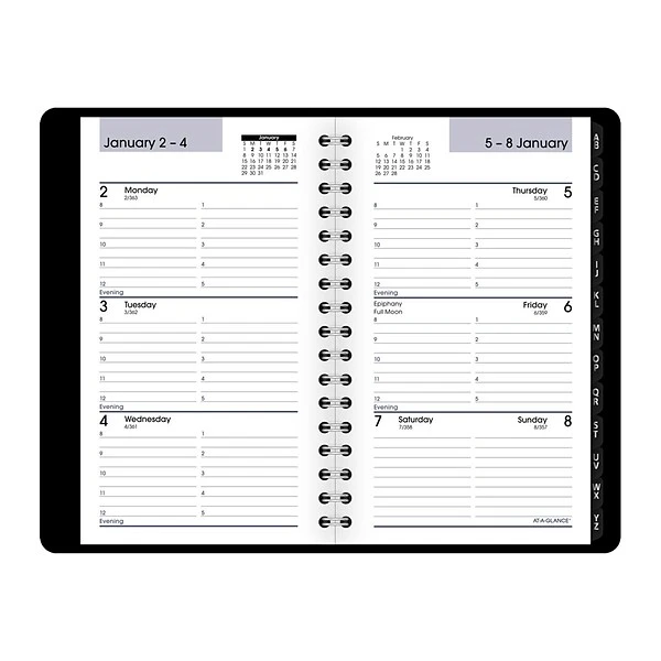 Take your plans and address book on the go with the AT-A-GLANCE DayMinder weekly appointment book. Stay organized between work and home all year long with this weekly appointment book. Each weekly spread has ruled daily blocks to help you keep track of your busy schedule.