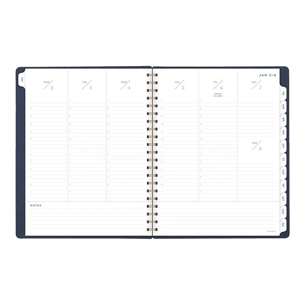 - One week per two-page spread with ruled daily columns, appointment times, and an extra area for notes; one month per two-page spread has unruled daily blocks, a notes section, past/future reference calendars