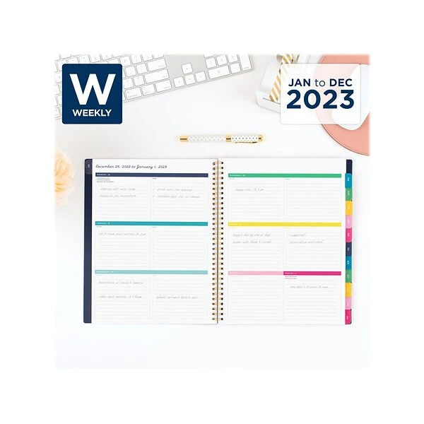 - Weekly and monthly planner covers a 12-month date range from January 2023 to December 2023