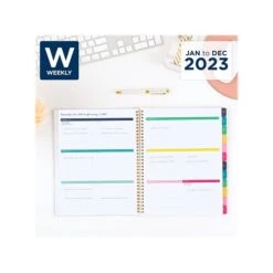 - Weekly and monthly planner covers a 12-month date range from January 2023 to December 2023