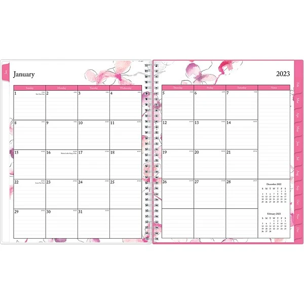 - Two-page weekly and monthly calendar layouts offer extra writing space