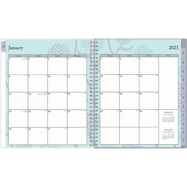 The Blue Sky 2023 monthly planner with storage pocket helps you keep a broad overview of your schedule. The planner features tabbed monthly planning calendars, dedicated notes pages, and a frosted flexible cover featuring a mint green Rue Du Flore design. At just 20 pages, this conveniently-sized monthly agenda won’t add bulk when you’re on the go. Dated from January 2023 to December 2023.