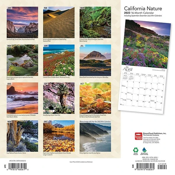 From its stunning coastline to its picturesque forests and mountains, there’s a bounty of natural beauty throughout California. The Golden State is home to magnificent wildlife and many natural wonders, and its gifts of nature are brilliantly displayed in this spectacular square wall calendar. Classic format. Updated style. Our wall calendars include stunning images and even clearer grids and text. Filled with an abundance of holidays, each month’s grid is large enough for daily tasks and appointments.