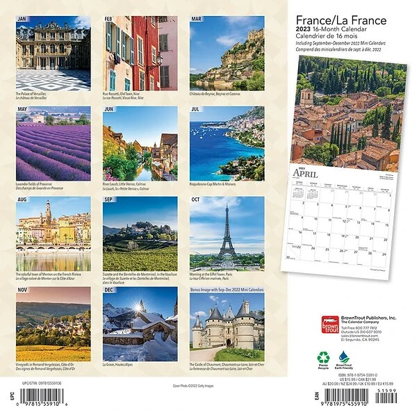 The French value style, refinement, unaffected elegance, and the simple pleasures in life—good food, good wine, and good company. Indulge your inner Francophile with this photographic feast for the eyes: the incomparable regions of France—from the Breton coast to Alsace, from Normandy to Provence, and the romantic City of Light, Paris. This bilingual square wall calendar features months, days, holidays, and photo captions in English and French. Classic square format. Updated style. Our wall calendars include stunning images and even clearer grids and text. Filled with an abundance of holidays, each month’s grid is large enough for daily tasks and appointments.