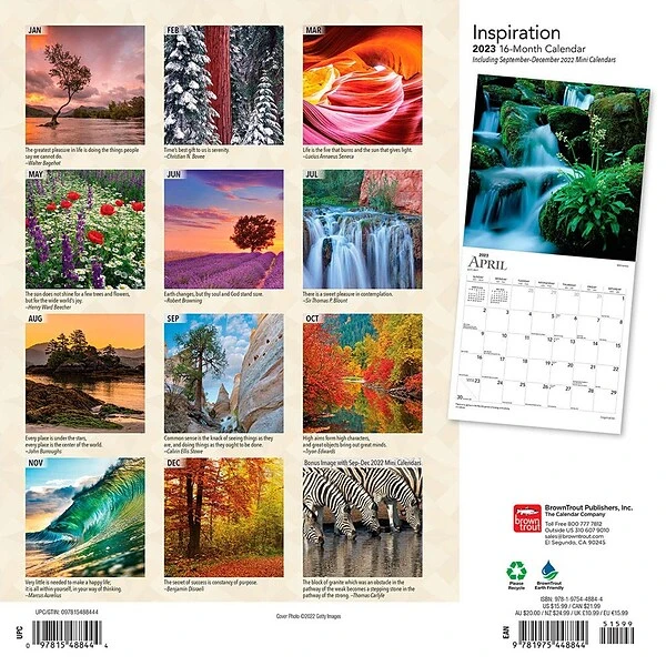 Inspiration can come from many sources—whether it’s friends and family, music and literature, religion and spirituality, or the beauty of the natural world. The lush photography and inspirational passages in this square wall calendar are sure to provide joy and rejuvenate the spirit. Classic square format. Updated style. Our wall calendars include stunning images and even clearer grids and text. Filled with an abundance of holidays, each month’s grid is large enough for daily tasks and appointments.