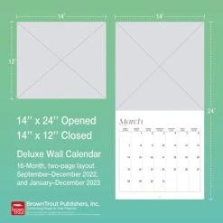 - Specifications – 16-months (two-page layout September–December 2022, and January–December 2023); 12″ x 12″ (closed); 12″ x 24″ (opened); 28 pages