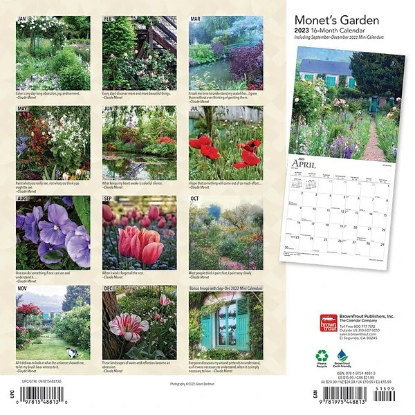 Enjoy photographs of the seasons in Monet’s garden at Giverny, which inspired so many of his paintings. This square wall calendar includes photographs with informative text about the garden. Classic format. Updated style. Our wall calendars include stunning images and even clearer grids and text. Filled with an abundance of holidays, each month’s grid is large enough for daily tasks and appointments. Each of these 12″ x 12″ calendars features an opening spread with a beautiful four-month calendar to plan the last four months of the year and rev up for 2023.