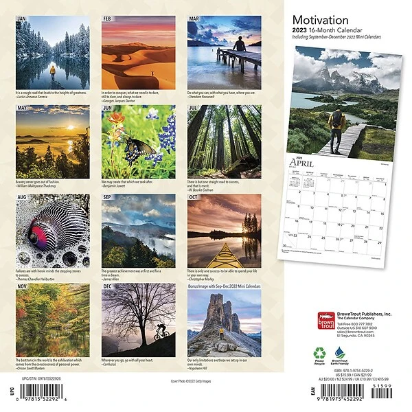 Whether facing a big task or a small one, we all have times when we could use a little motivation. As Winston Churchill famously said, “If you’re going through hell, keep going.” Each page of this Motivation square wall calendar features a stunning scene of the natural world along with an inspiring motivational quote that complements the image. Classic square format. Updated style. Our wall calendars include stunning images and even clearer grids and text. Filled with an abundance of holidays, each month’s grid is large enough for daily tasks and appointments.