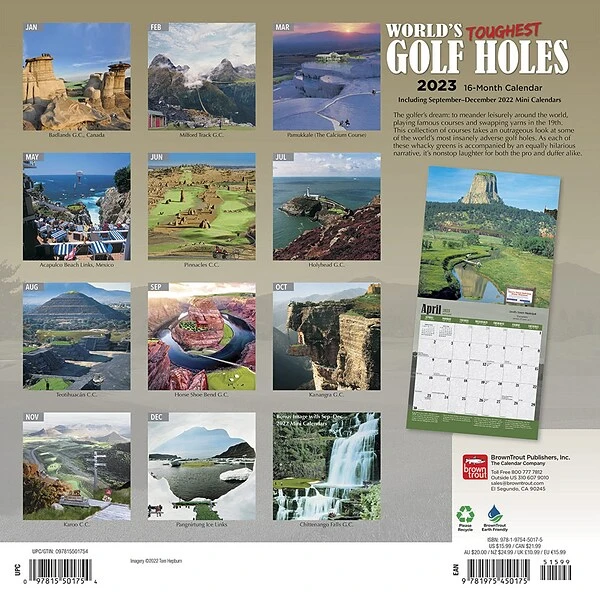 Enjoy an outrageous look at some of the world’s most insanely adverse golf holes. Each of these “whacky” greens is accompanied by an equally hilarious narrative. This realistically photo-enhanced 12-month wall calendar is the perfect gift for expanding the imaginations of your golf-loving friends and family members. Classic square format. Updated style. Our wall calendars include stunning images and even clearer grids and text. Filled with an abundance of holidays, each month’s grid is large enough for daily tasks and appointments.
