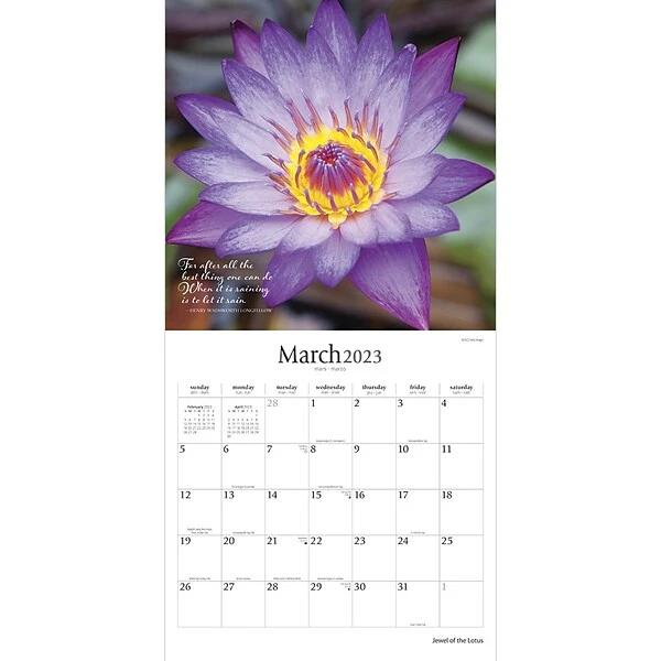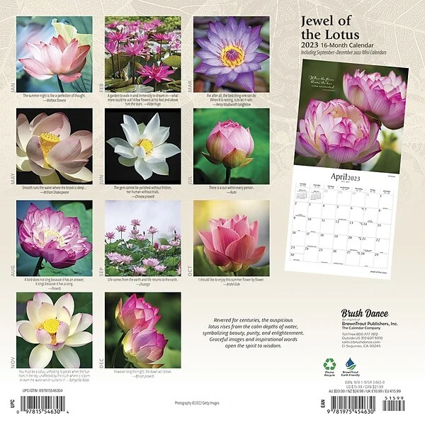 Rising from the depths of calm water, the lotus symbolizes beauty, purity, and enlightenment. Long revered, the lotus has been a major symbol in cultures throughout the world and time, including Ancient Egypt, China, Japan, and India. This calendar features beautiful images of this magnificent flower, as well as inspirational words for the spirit to inspire wisdom. Classic square format. Updated style. Our wall calendars include stunning images and even clearer grids and text. Filled with an abundance of holidays, each month’s grid is large enough for daily tasks and appointments.