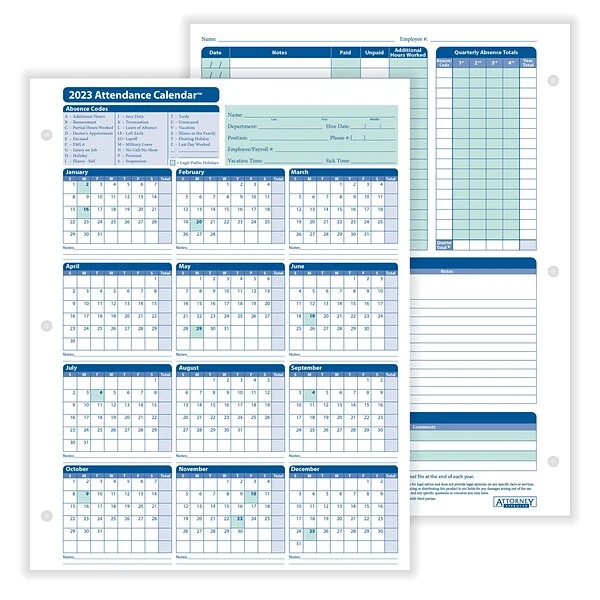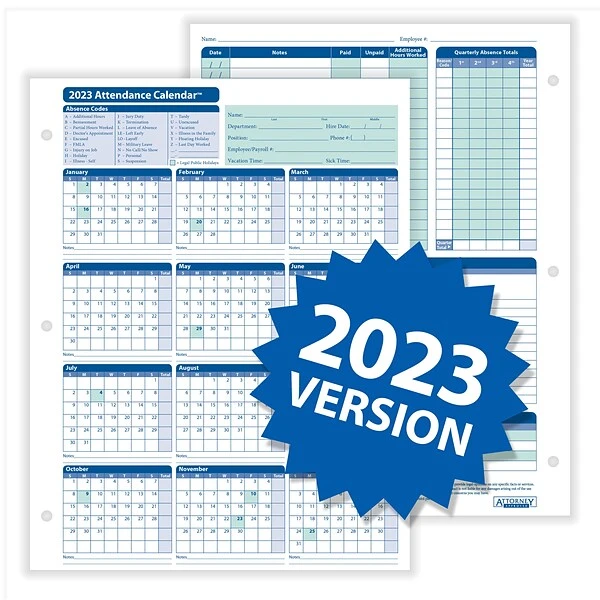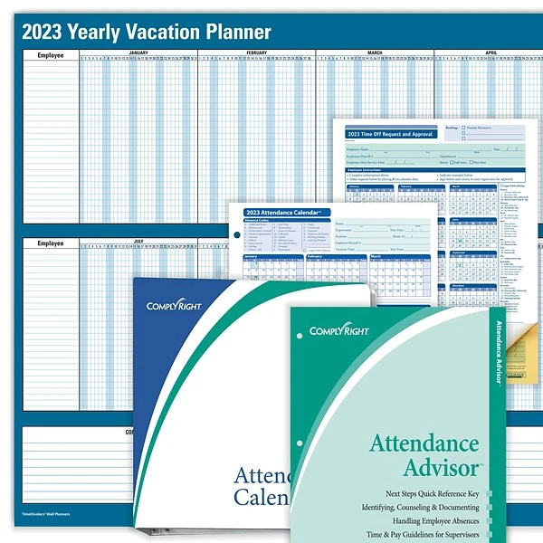 - Attendance tracking kit: 50 two-part time-off request and approval forms (A0030), 25 8.5″ x 11″ white attendance calendar kit (A1411W16PK25), 36″ x 24″ yearly vacation planner (J1712)