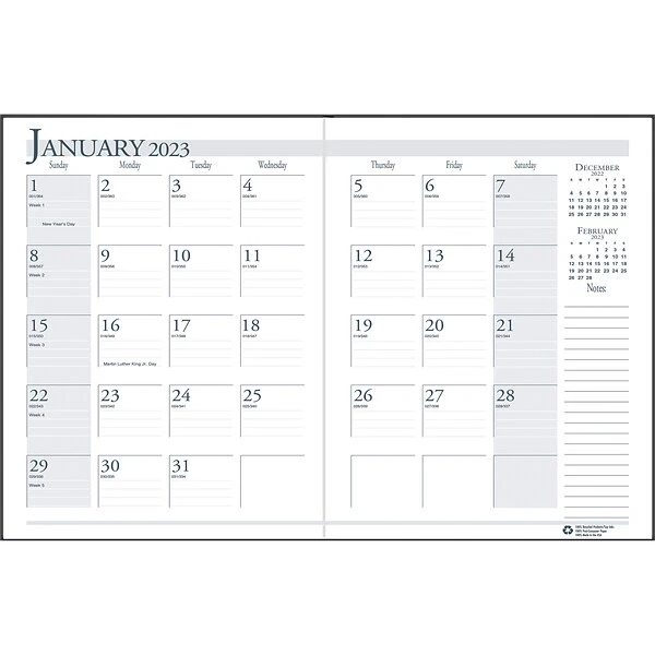 The one-piece black stitched cover makes this House of Doolittle appointment planner very thin and easy to carry in purse or brief case. Lightly ruled daily blocks keep notations neat. Additional information pages include important dates and holidays, a three-year reference calendar, and a lined contact information page.