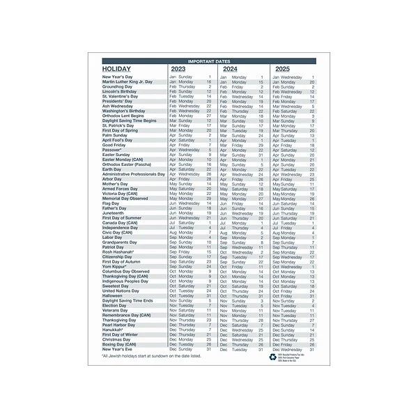 - Additional page with important holiday dates for three years in a list form