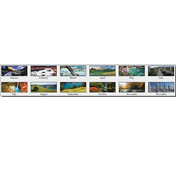 This House of Doolittle Earthscapes Scenic three-month wall calendar features a unique scenic image and an inspirational quote. It includes a sturdy wire hanger to easily hang the calendar on the wall and a full-year reference calendar on each page.