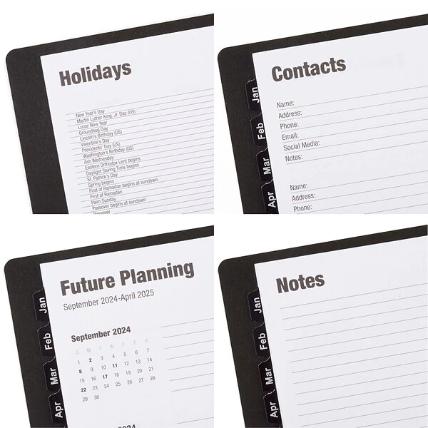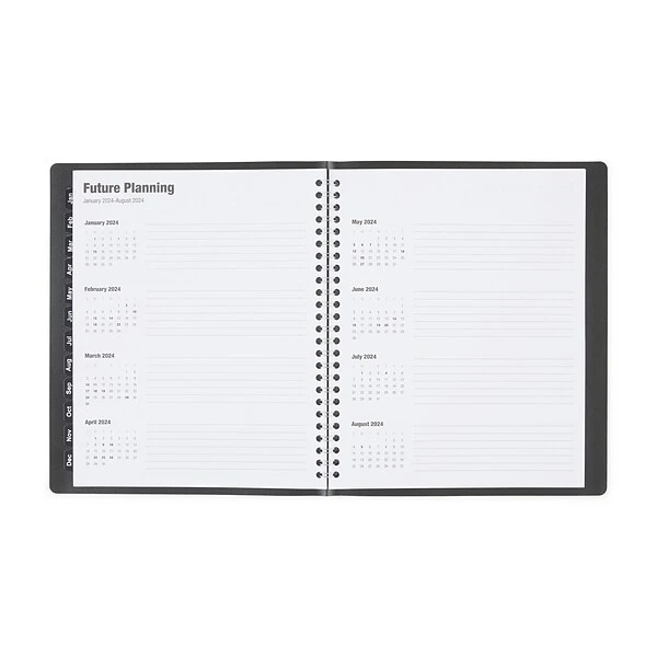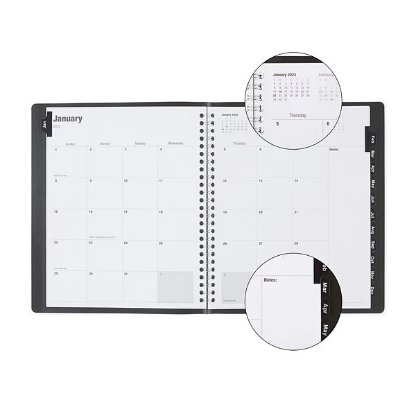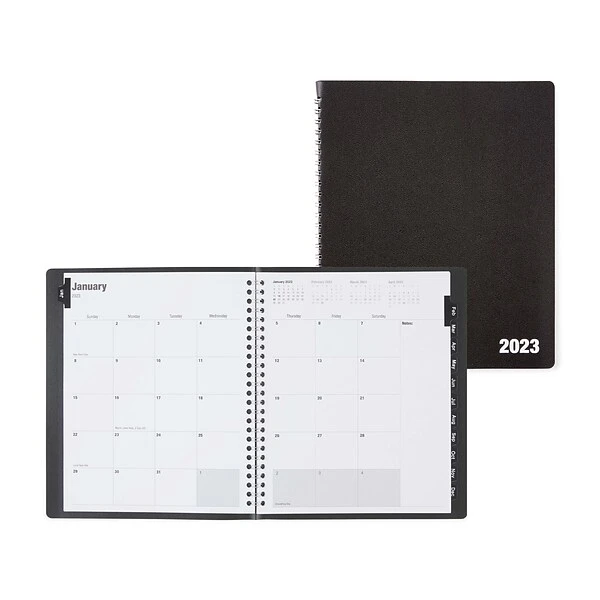 Keep a reminder of tasks to accomplish on your desk with this black monthly appointment book. The 14-month format lets you easily plan ahead, while the ruled lines offer efficient use of space. This Staples 7 x 9-inch black monthly appointment book features a spiral spine construction for easy page access, and the Pajco cover keeps the contents protected.