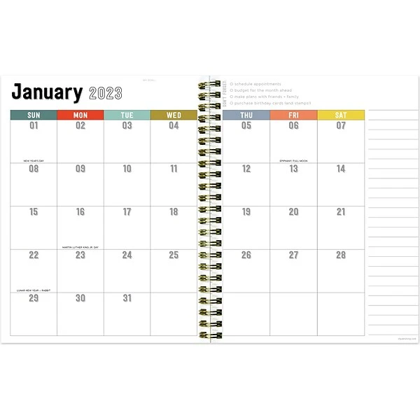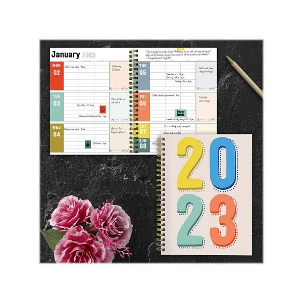 Fun and function in one place. The TF Publishing Big & Loud Year medium weekly and monthly planner makes organizing your life easy and fun. The all-encompassing medium planner boasts two-page monthly spreads that include lined sections for notes, tasks and goals, and two-page weekly spreads with lined daily sections to keep your plans neat and organized, plus a dedicated weekly priorities section to help keep you focused. The interior pages are designed with a whimsical and folky feel, accented with faux monthly tabs for easy access to weekly planning. Enhance your daily plans with 216 color-coordinating stickers to highlight special occasions and personalize your planner. Bonus lined notes pages are in the back, with yearly 2023 and 2024 views in the front. Featuring a durable textured cover and trendy gold-tone wire-O binding to lay flat when open, this 12-month planner covers January 2023 through December 2023 and contains no plastic.