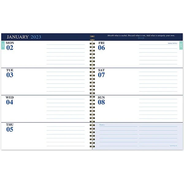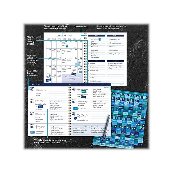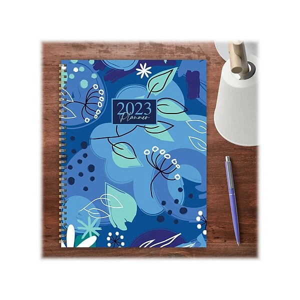 With a new take on a classic style, getting organized is easy with the TF Publishing Blue & Berries 2023 planner that features an expressive and updated floral design. Measuring 9″ x 11″, the all-encompassing large planner boasts monthly two-page spreads that include lined sections for notes, tasks, and goals and weekly two-page spreads with lined daily sections to keep plans neat and organized, plus a dedicated weekly priorities section to help keep you focused. The interior pages are designed with a casual and traditional feel, accented with faux monthly tabs for easy access to weekly planning. Enhance your daily plans with 368 color-coordinating stickers to highlight special occasions and personalize your planner. Bonus lined notes pages are in the back, with yearly 2023 and 2024 views in the front. Featuring a durable textured cover and gold-tone wire-O binding designed to lay flat when open, this 12-month planner covers January 2023 to December 2023 and contains no plastic.