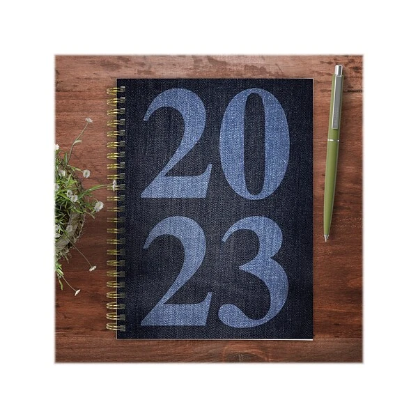 Keep calm and plan on. Reduce your stress and stay organized with this straightforward 2023 planner. The TF Publishing Dark Wash all-encompassing medium planner boasts two-page monthly spreads that include lined sections for notes, tasks and goals, and two-page weekly spreads with lined daily sections to keep your plans neat and organized, plus a dedicated weekly priorities section to help keep you focused. The interior pages are designed with a traditional and casual feel, accented with faux monthly tabs for easy access to weekly planning. Enhance your daily plans with 216 color-coordinating stickers to highlight special occasions and personalize your planner. Bonus lined notes pages are in the back, with yearly 2023 and 2024 views in the front. Featuring a durable textured cover and gold-tone wire-O binding to lay flat when open, this 12-month planner covers January 2023 through December 2023 and contains no plastic.