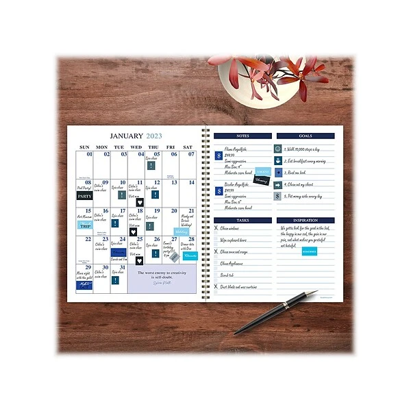Getting everything on the same wavelength is easy with this expressive blue-striped 2023 planner. The TF Publishing Navy Frequency all-encompassing large planner boasts two-page monthly spreads that include lined sections for notes, tasks and goals, and two-page weekly spreads with lined daily sections to keep your plans neat and organized, plus a dedicated weekly priorities section to help keep you focused. The interior pages are designed with a casual and traditional feel, accented with faux monthly tabs for easy access to weekly planning. Enhance your daily plans with 368 color-coordinating stickers to highlight special occasions and personalize your planner. Bonus lined notes pages are in the back, with yearly 2023 and 2024 views in the front. Featuring a durable textured cover and gold-tone wire-O binding to lay flat when open, this 12-month planner covers January 2023 through December 2023 and contains no plastic.