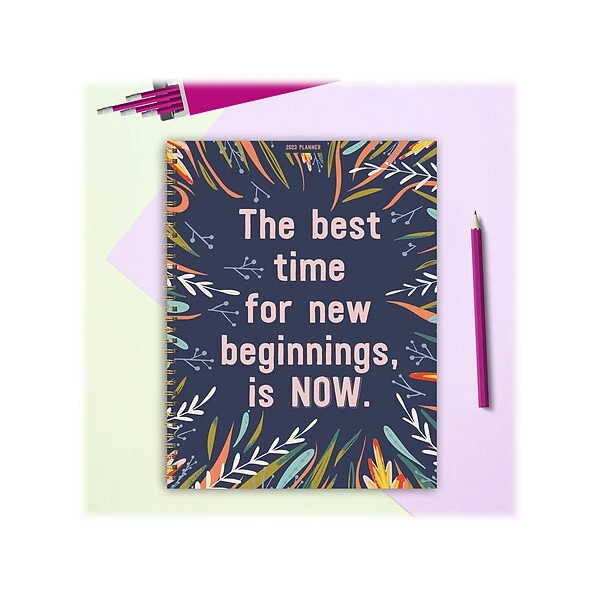 Radiate positivity! The TF Publishing New Beginnings large 9″ x 11″ planner features a cheerful and rustic cover design with a motivational reminder to believe in yourself. The layout boasts monthly two-page calendar grid overview pages with space to write tasks and highlights, plus a dot grid for doodling and weekly two-page spreads that provide plenty of vertical planning space as well as a weekly habit tracker. Interior planning pages are accented with bold colors and faux monthly tabs for easy access to weekly planning. Bonus lined notes pages are in the back, and yearly 2023 and 2024 views are included in the front. The planner has a durable textured cover and gold-tone wire-O binding to lay flat when open, plus 368 color-coordinating stickers. This 12-month planner covers the months of January 2023 to December 2023 and contains no plastic.