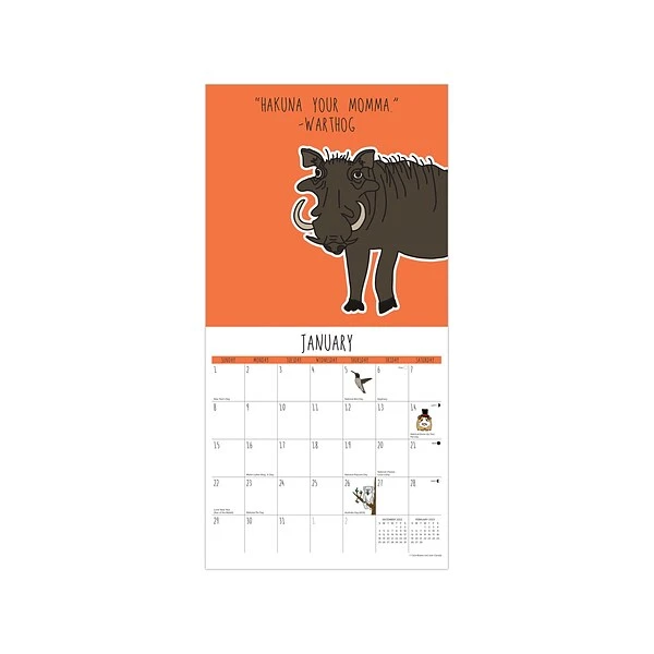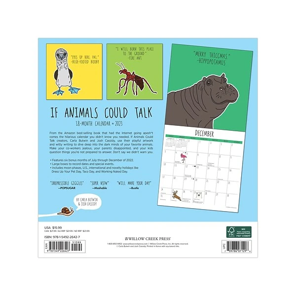 Born from the hit Tumblr blog, If Animals Could Talk, creators Carla and Josh use their witty writing and unique illustration style to dive deep into the minds of your favorite animals. Seriously, they get all up in there. This is one of those rare calendars considered to be both the bee’s knees and the cat’s meow. Printed with soy-based inks on FSC certified paper, this Willow Creek If Animals Could Talk 12″ x 12″ wall calendar features large monthly grids that offer ample room for jotting notes, along with six bonus months of July 2022 through December 2022. Also includes moon phases (CST), standard US and international holidays and a smattering of unexpected ones like National Donut Day, National Taco Day, and Mean Girl’s Day.