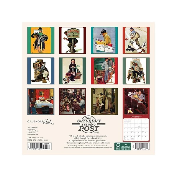 Norman Rockwell began illustrating covers for The Saturday Evening Post in 1916, an association that lasted nearly half a century. His greatest covers are anecdotes about average Americans, each a scene telling a story with a remarkable amount of detail. He will always be remembered for his distinctive style and exceptional artistic technique. But more importantly, Norman Rockwell will be remembered for capturing, like no other artist, the essence and the innocence of 20th century America. Printed with soy-based inks on FSC certified paper, this Willow Creek The Saturday Evening Post 7″ x 7″ mini wall calendar features large monthly grids that offer ample room for jotting notes, along with six bonus months of July 2022 through December 2022. Also includes moon phases (CST), standard US and international holidays.