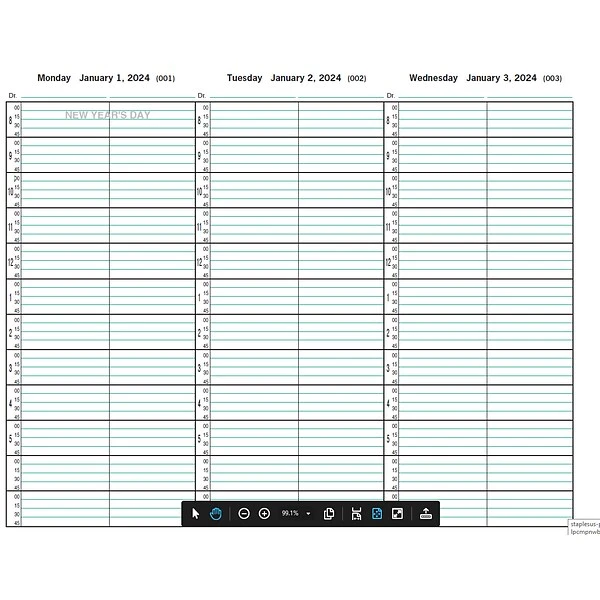 - Daily/monthly format displays Monday-Saturday, 8am-6:45pm w/extra 15min line