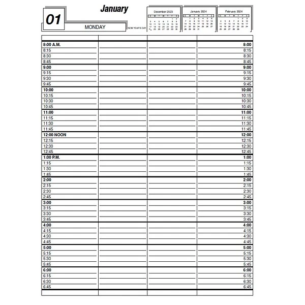 - Daily/monthly format displays Monday-Saturday, 8am-6:45pm w/extra 15min line