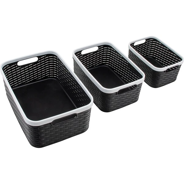 Organize your home or office workspace with this three-pack of Nantucket weave bins. The sophisticated woven design will allow you to sort your clutter while seamlessly blending in with your décor. You can use the bins for craft supplies, paperwork, pantry or laundry items, bedrooms, and more.