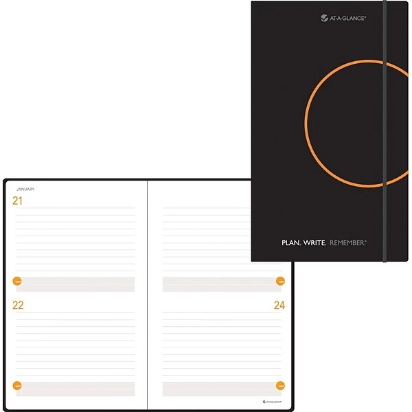 Daily planning notebook helps you to plan, write and remember so you have an effective vehicle for your ideas and plans. Perfect-bound, soft, simulated leather cover with bungee closure protects the dated planning pages. You can store loose paper in the gusset pocket. One-page-per-two-day format includes ruled planning space for most of the daily entry and a Hot-spot reminder section at the bottom. Business notebook also offers a ribbon page marker, three-year reference calendars and bonus information pages including index, contact and event-planning pages.