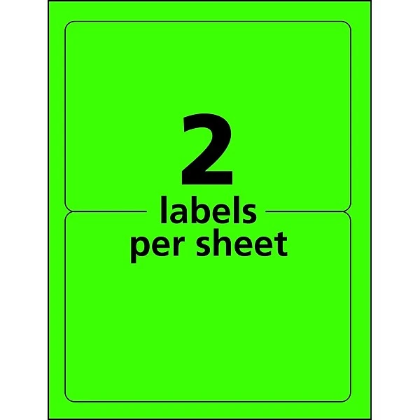 Create eye-catching printable color labels and make your next project or shipment stand out with Avery Neon Green Shipping Labels for Laser Printers. Having engaging labels with attention-grabbing colors can provide the additional appeal needed for any catchy phrase. Whether you’re creating Identification labels or packaging labels, these bright color labels can help capture your audience’s attention. Easily design and personalize your unique printable labels with the thousands of free designs and templates at avery.com/templates. Having a label without a strong stick can ruin any labeling project. For long lasting hold on any surface, these strong stick 5 1/2″ x 8 1/2″ fluorescent green neon labels are designed with a permanent adhesive. Expect high-quality, smudge free printing results with these laser printer optimized neon labels.