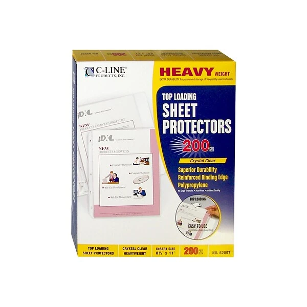 File frequently handled documents in office binders with these letter-size sheet protectors. The prepunched edges work with standard three-ring binders, and the smooth, clear finish ensures your papers remain visible. A top-loading design makes it easy to add and remove pages as needed. Featuring heavy-gauge construction, these C-Line sheet protectors keep forms, reports and other paperwork safe from dirt and damage.