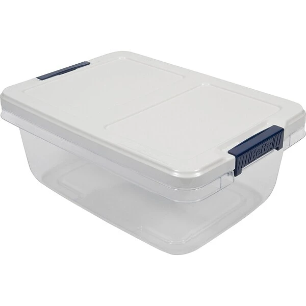 - Clear base, supplemented by white lid and dark blue latches, provides easy identification of contents and is made of plastic, while reinforced, double rimmed walls and lid crossbars add durability