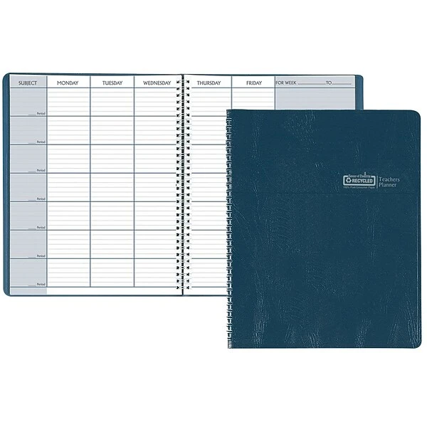 Features 45 undated weekly spreads, each divided into seven periods, with space for notes. Includes seating chart, test and attendance records, and term program.