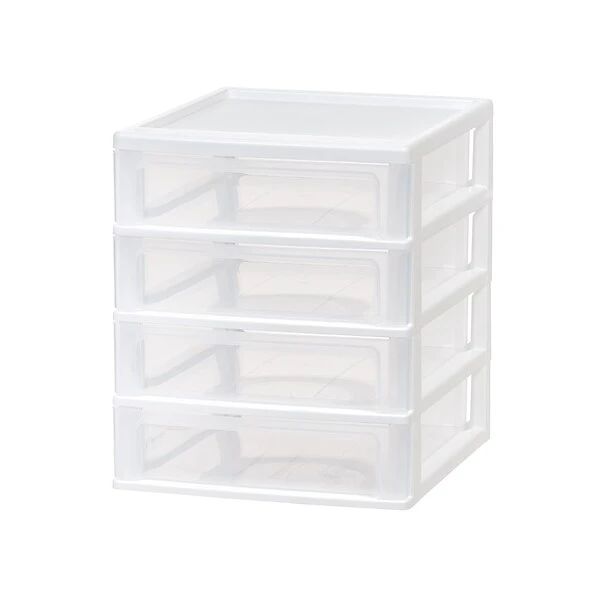Store more with more space. The Iris four-drawer desktop unit is great for maximizing storage. Great for your home, office, or garage to clean up your desktop or shelf. Put in the drawer anything from makeup brushes, first aid, craft, and office supplies. The clear drawer makes it easy for you to see where and what you’ve placed. Stackable to save space. Organize and declutter your workspace or living area with this Iris desktop unit. Made in the USA.