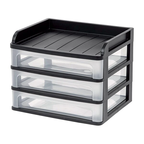 Add extra storage to your office with this desktop drawer system. The three pullout drawers and top tray hold small desktop and household supplies, making it easy to organize all your essentials. Each drawer features clear plastic construction, so you can see the items stored inside. With its compact size, this Iris drawer system takes up minimal space on a desk, shelf or credenza.