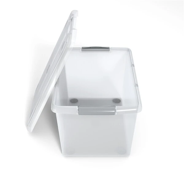 Store, stack, slide and easily locate items with this durable Store & Slide clear bin. The 61-quart capacity of this bin makes it ideal for storing a variety of items, and the lid locks on tightly with latches on each handle. There are plastic disks on the bottom of this tote designed to help it slide along on indoor surfaces.