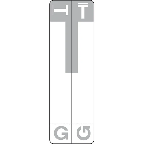 Each label is printed with 2 letters, just strip away the letter not used. Designed to match Smead® Alpha-Z® name labels. 100 Olive Green “G & T” labels per pack. Size: 3-5/8″ x 1-1/8″ before folding.