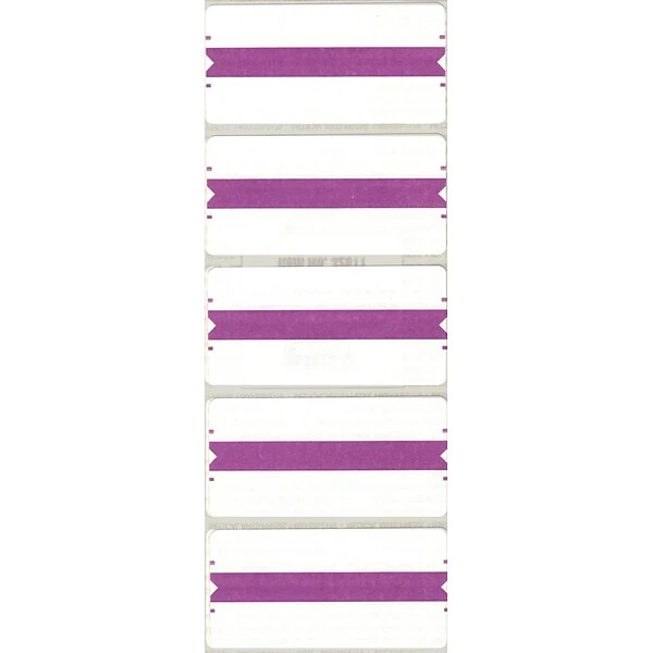 Two name labels in one. Lavender bar with white label area wraps around tab so name and color are visible from both sides. Pressure-sensitive. Furnished 5 labels per sheet; 250 Lavender labels per pack. Label size: 3-1/4″ x 1-5/8″ before folding.